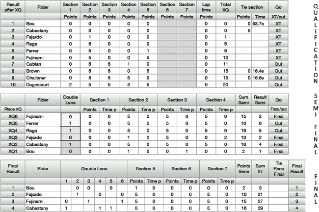 Albert Cabestany (Sherco) no estuvo todo lo acertado que buscaba, pero el simple pase a la final ya le otorgaba la renovación del subcampeonato frente a Adam Raga (Gas Gas), que arriesgó y perdió, quedando fuera del pase a la final por primera vez en la temporada. Si bien Cabestany contaba con la ventaja de realizar las zonas después de Raga, ambos fallaron más de lo habitual y con el pase de Cabestany a la fase final Raga se quedaba otra vez con el tercer puesto en la final del campeonato. La fase de calificación fue dura e interesante, demostrando que el listón estaría muy alto durante toda la noche. Como habitualmente, consistió en cinco zonas que se debían completar en ocho minutos. El francés Alexandre Ferrer (Sherco) causó sensación ante su público al convertirse en el primer piloto invitado que este año ha conseguido pasar a la semifinal. Sin embargo las cosas no le fueron tan bien a su compatriota Loris Gubian (Gas Gas), ya que como único piloto permanente de Francia en el campeonato tenía la intención de hacer su mejor trial en París, pero sufríauna caída desde un punto muy alto de la segunda zona. Esto dejó tocada su confianza y ya no se pudo recuperar, lo que finalmente le costó su pase a la semifinal.