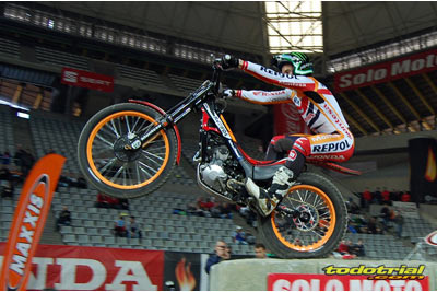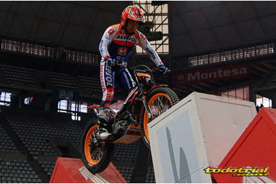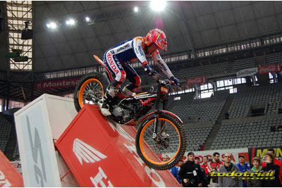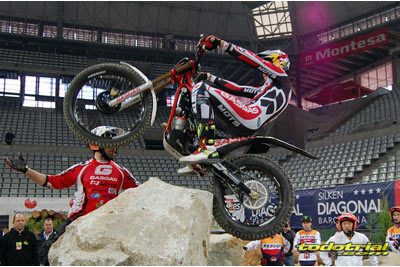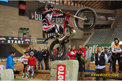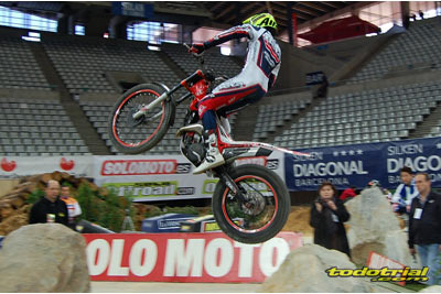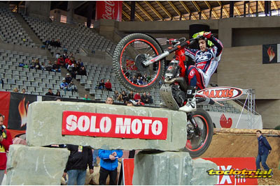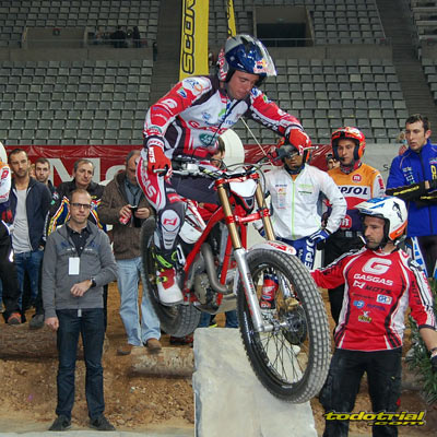 En Todotrial no quisimos perdernos la 36 edición del Indoor de Barcelona, segunda cita del mundial y allí estuvimos para contároslo de primera mano en este segundo reportaje. Una prueba más, y van ya bastantes, Toni Bou ha vuelto a subir a lo más alto del cajón en una prueba del Cto. Mundo de X-Trial (popularmente llamado Trial Indoor). El dominio del piloto de Montesa ha sido incontestable, dejando al resto de pilotos con un "quiero pero no me dejan" con el que parece que Bou se ha propuesto dominar este certamen 2013. La prueba dio comienzo por la mañana en la que se disputó la fase clasificatoria que constaba de 5 zonas, las dos marcadas con Solomoto de piedras, la zona Burn, la zona Honda y la zona de Solomoto de bidones. En esta fase preliminar, se da uno cuenta la gran diferencia que hay entre los 5 grandes y el resto, aunque se vio a un Fujinami muy nervioso y un tanto "mayor" puesto que hizo fiasco en 4 de las 5 zonas, debiendo desempatar con Challoner para ver el orden de salida en la ronda semifinal. Destacar que Bou acabó con 0 en todas y los pilotos eliminados fueron el Francés Ferrer y el italiano Grattarola.