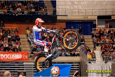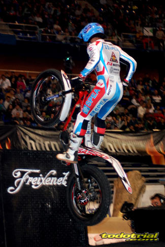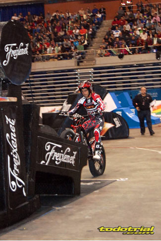 Y es que por la general, en una semifinal vemos a los "no-tops" marcando 5 tras 5 y dejando al público perplejo, que no entiende el por qué participa alguien que no consigue pasar ninguna zona... Con esta premisa, los 5 pilotos, llamémosles "noveles", se dejaron la vida en busca de esa pasada perfecta para conseguir su pase. Aunque incomprensiblemente, no fueron los fijos del Mundial X-Trial los que más se dejaron el alma en conseguirlo, ya que Challoner (que sí paso a las semis en Barcelona) y Ferrer (que en los triales Indoor de exhibición que se han celebrado en Francia antes de las pruebas del Mundial, había cosechado grandes resultados), marcaron cada zona de las 5 previstas en esta fase con fiasco. El desparpajo de Pere Borrellas, que llevó el peso de abrir el cartel, con un 1 en la zona Freixenet, ya empezó a dejar boquiabiertos al maravilloso y entusiasta público malagueño, que en unos 4.000 personas llenaban las gradas del Polideportivo Martín Carpena.