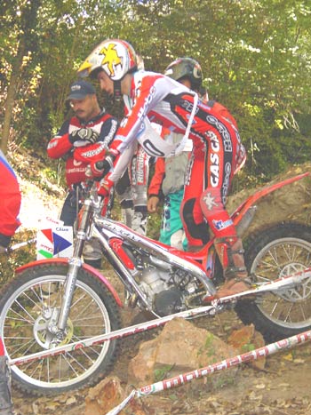 Ya de entrada, y mientras esperábamos a los pilotos en la zona dos de la primera vuelta, tuvimos que ver como transcurría casi media hora desde el paso del último senior B, hasta la llegada del primer grupo de senior A, con la excepción de Marcel Justribó y de Jordi Pascuet, que ya empezaban a distanciarse del resto. Total, que el grupo de Freixa, Raga, Cabestany y Cobos casi se había "comido" una hora en la zona uno, y es que esta fue quizás la zona más difícil del trial, al menos en la primera vuelta, ya que todos los Senior A a excepción de los dos pilotos de Gas Gas, vieron como les caía el primer fiasco al no poder superar una fortísima pendiente. Marc Colomer demostraba su clase dejando un solo pié, mientras que Raga marcaba un valioso dos, con todos sus rivales ya con cinco puntos.