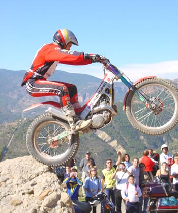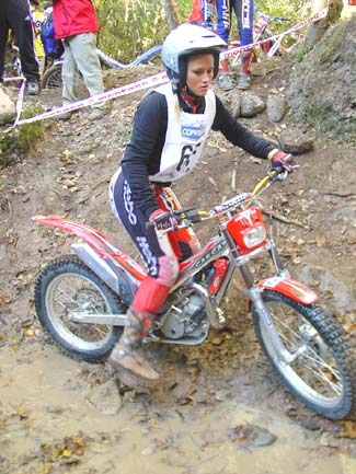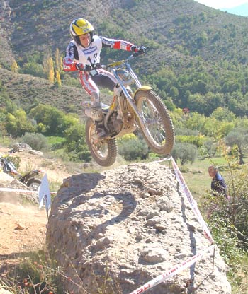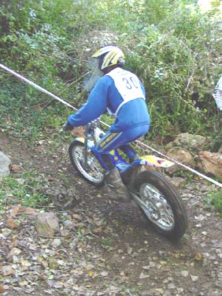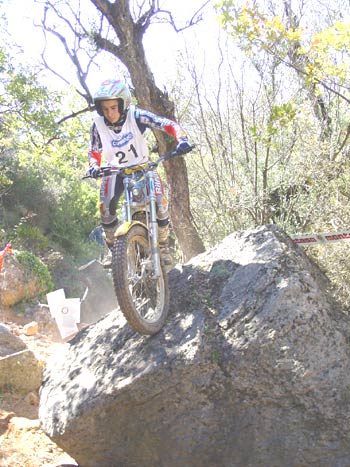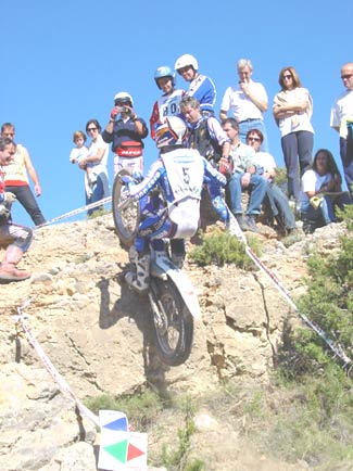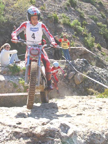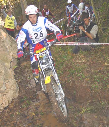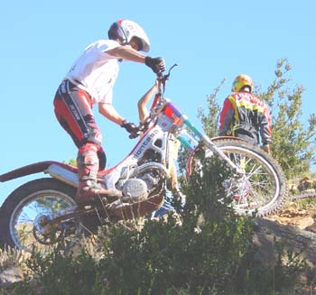 Estamos ya en la zona nueve, y aquí casi se decidió el trial. Tenía un par de escalones sin excesiva dificultad a la entrada, para después de una curva a la derecha remontar una subida también sobre roca hasta llegar a otro escalón de aproximadamente un metro y medio pero absolutamente hueco , sin espacio prácticamente para coger velocidad y con un fino hilo de agua deslizándose entre las rocas. La salida del escalón era el punto más difícil de la zona, ya que un paso estrecho prácticamente en forma de "V" y también mojado, hacía que las motos, casi sin tracción después del escalón, prácticamente tuvieran que ser sacadas a base de "golpes de riñón", para seguidamente afrontar una subida sobre una losa acabada en un espectacular salto para superar un agujero de más de un metro entre las piedras que ponía a prueba las suspensiones de la moto y las rodillas de los pilotos. Justribó, que continuaba muy por delante del grupo de Senior A, marcaba un excelente dos, y Pascuet un aún mejor uno, mientras que al poco rato aparecían los tres pilotos de Beta, con Bou penalizando un varios y realizando la zona en primer lugar. Cabestany era el siguiente, y superaba sin problemas las piedras de la entrada, pero cuando encaraba la primera subida la rueda trasera le hacía un extraño al patinar sobre la roca húmeda y se quedaba a media pendiente, retrocediendo claramente, con lo que el fiasco estaba cantado. Los gritos de rabia de Albert eran fiel de reflejo de que sabía que en ese momento acababa de perder casi todas sus opciones a la victoria. Manzi por el contrario se apuntaba un discutible dos que en opinión del piloto y también nuestra era un uno, pero todos sabemos lo difícil que es la apreciación por parte del control de si ha habido o no parada. Las Gas Gas llegaban a continuación y Colomer no fallaba con un pie en la parte más difícil de la zona, justo tras el escalón intermedio, mientras que Raga, avisado del error de Cabestany, se lo jugaba todo y aunque por los pelos y filtreando con el fiasco se apuntaba un bonito cero, con lo que el parcial de la segunda vuelta se decantaba muchísimo a su favor, con cinco puntos de ventaja sobre Cabes.