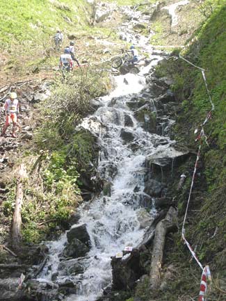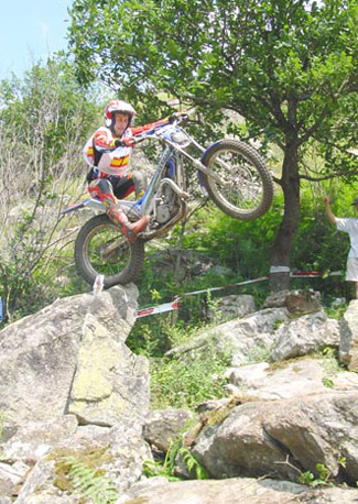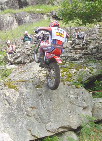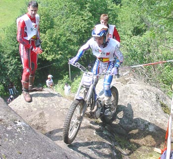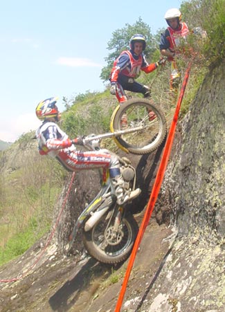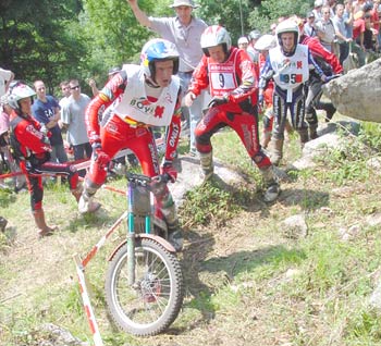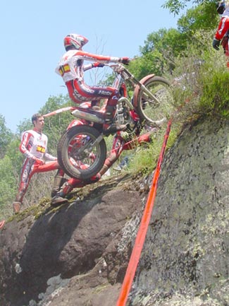 Eso es lo que debió pensar Dougie Lampkin, quien al finalizar el primer giro tenía perforada toda la banda izquierda de su tarjeta, con nada menos que quince preciosos ceros. Hay que decir de todas formas que el trial no planteaba dificultades serias para los punteros hasta prácticamente la zona trece, que con una fuerte pendiente sobre roca y un impresionante escalón que daba cierto "repelús" a los primeros en llegar, quienes se picaban el cinco directamente. Con Fajardo, Manzi y cia. se cambiaba el panorama, y poco a poco los pilotos empezaban a "limpiar" la trazada como hacen normalmente. La llegada de un miembro de la organización con una larga cuerda que atada a un árbol permitía a los mochileros asegurar un poco al piloto en caso de fallar en el escalón, daba luz verde a que los primeros valientes intentaran el tranco, con poco éxito, todo hay que decirlo, porque por este mismo orden Fajardo, Manzano, Colomer, Raga y Cabestany se cargaban con un fiasco.