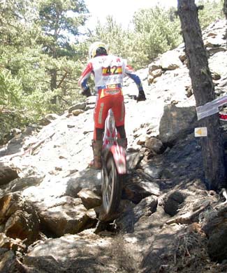 Esta particularidad convirtió éste trial en multitudinario (más de 190 participantes) y el sábado ya se pudieron comprobar las virtudes y tambien algun "defectillo" de esta nueva fórmula. El principal "pero" era que los españoles veían las zonas demasiado fáciles y todo el mundo estaba pensando que ante la avalancha de participantes el tiempo pasaría muy rápido, a pesar de que la organización daba 7 horas para realizar las dos vueltas al precioso recorrido entre las montañas de la zona. El recorrido tenía entre 20 y 25 kilómetros lo que al final ayudó a estirar la carrera y prácticamente no hubo colas. La pena era que al estar compitiendo no podías admirar los fantásticos parajes por donde discurría.