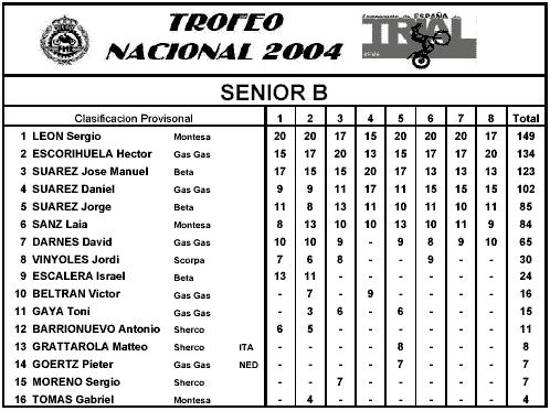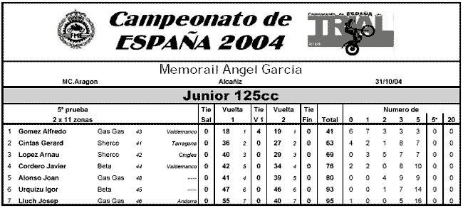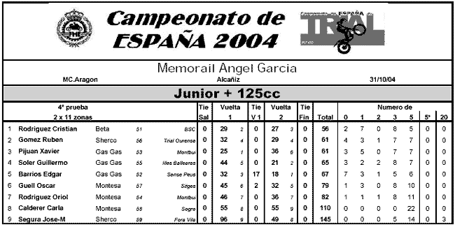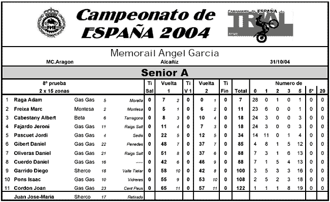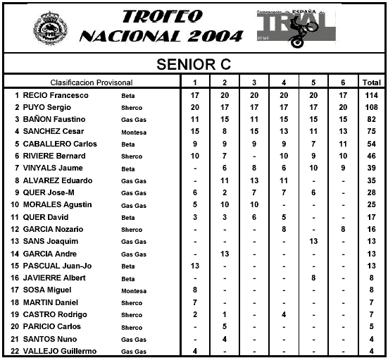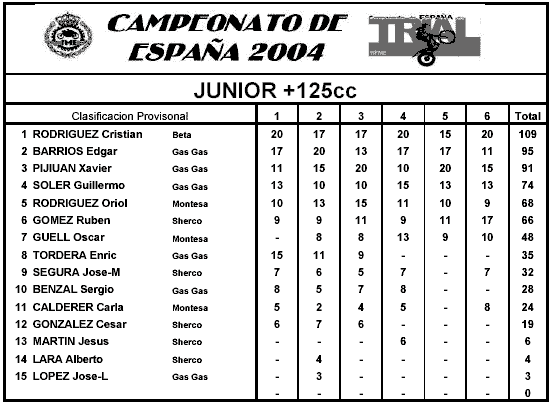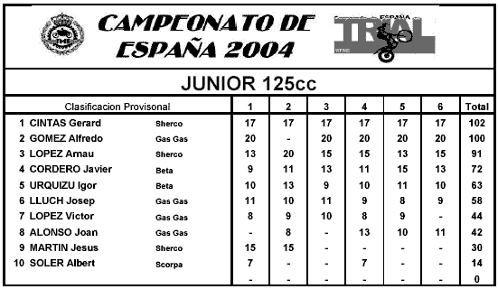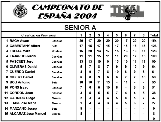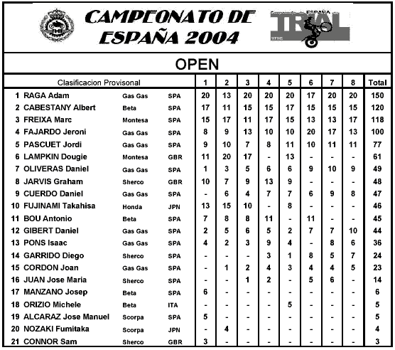 De este modo Raga sumaba una victoria más con un total de 7 puntos, Freixa se quedaba a 4 puntos, con 11, y Cabestany completaba el podio tras superar a Fajardo en el desempate, ya que ambos estaban empatados a 18. Para resolverlo hubo que acudir al procedimiento de contar desde la última zona quien había sido el último en cometer un fallo, ya que los dos estaban empatados a ceros, unos, doses... Finalizaba así un interesante campeonato nacional que daba su primer título al piloto de Gas Gas Adam Raga, el subcampeonato quedaba finalmente en manos de Cabestany y Freixa quedaba tercero a sólo 3 puntos. La misma clasificación quedaba en la nueva categoría Open, en la que aparece Lampkin en sexto lugar, Jarvis en el octavo y Fujinami en el décimo, pilotos que sólo tomaron parte en la primera mitad del campeonato y cuya no participación en las últimas citas ha restado interés al que podía haber sido un interesante campeonato Open, en el que poco habría que envidiar al mundial.