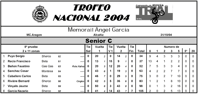 En Senior C las penalizaciones por tiempo en el primer giro fueron determinantes, por lo que al final el trial se decidió más por la rapidez de los pilotos en efectuar el recorrido que por sus puntuaciones en las zonas. Esto favoreció al piloto de Todotrial OF3 Sergio Puyo, que de esta manera se hacía con la victoria, aventajando en tres puntos a su rival de siempre, Francesc recio, el cual una vez más revalidaba el título nacional, por delante de Puyo y Faustino Bañón, tercero tanto en Alcañiz como en la clasificación final del nacional.