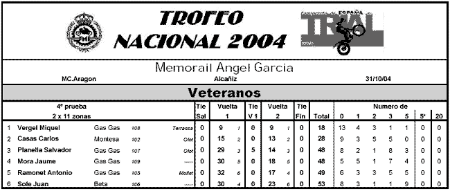 Y en Veteranos, la participación es cada día más escasa, y si antes lo habitual era superar la veintena de pilotos en Alcañiz se tocó fondo con sólo seis. El vencedor era de nuevo Miquel Vergel, que de este modo se adjudicaba el campeonato y terminaba con el dominio ejercido en los últimos años por Carles Casas, que era segundo en Alcañiz seguido de Salvador Planella, y que se tenía que conformar con el subcampeonato. Joan Solé era tercero en la final.