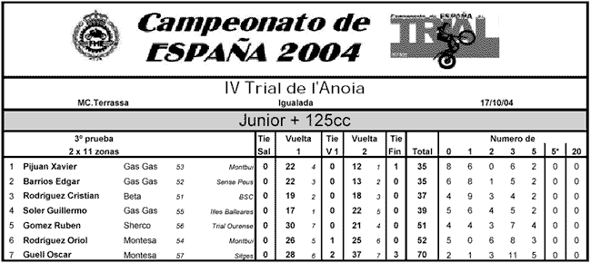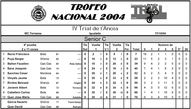En Senior C se repetía el ya casi eterno podio, con Francesc Recio en primer lugar, seguido del piloto Todotrial OF3 Sergio Puyo, ambos muy distanciados en puntos, y con Faustino Bañón en la tercera posición. En Junior 125 repite victoria Alfredo Gómez, segundo era Gerard Cintas y tercero Javier Cordero. En Junior 250 el ganador era Xavier Pijuan, empatado a puntos con Edgar Barrios y cerraba el podio Cristian Rodríguez con dos más.