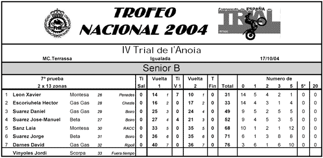 En Senior B la victoria era para el de Scottishtrial Xavi León, que se imponía por tan sólo dos puntos ante Héctor Escorihuela y matemáticamente lograba también el título en la categoría. Daniel Suárez cerraba el podio por delante de su primo José Manuel y Laia Sanz lograba la quinta plaza haciendo debutar la Montesa Cota 4RT en el Campeonato de España absoluto.