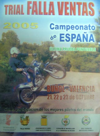 El próximo día 23 de Octubre se celebra la ultima prueba del Campeonato de España en la localidad valenciana de Buñol, promovido y organizado por la Falla Las Ventas de dicha localidad y con el apoyo técnico de la Federación Valenciana de Motociclismo. Esta falla dispone de un equipo de aficionados al mundo del motor los cuales están organizando pruebas puntuables para el territorial de la Comunidad Valenciana desde 1991, incluso en 1998 consiguieron que la federación les concediera el diploma acreditativo como mejor trial de la temporada. La prueba dará comienzo a las 9:00 horas desde el Barrio de San Rafael.