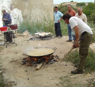 Los organizadores preparando una paella tras una jornada de trabajo