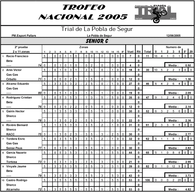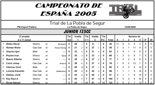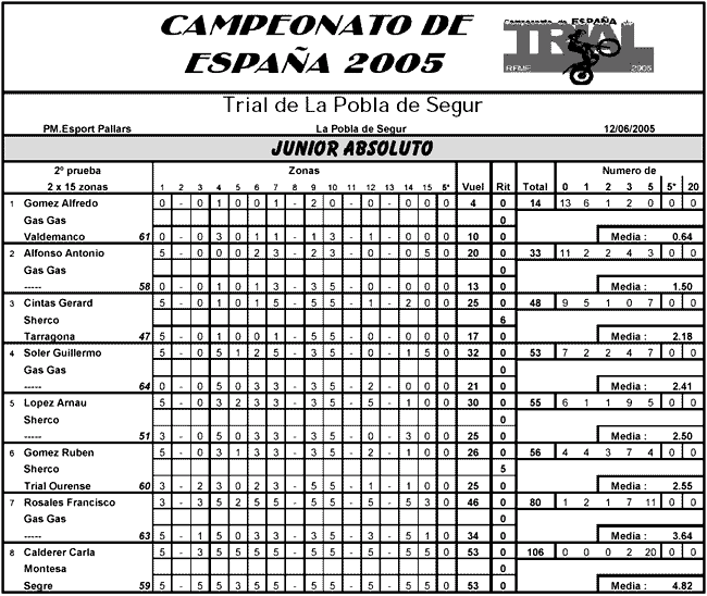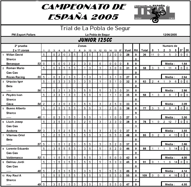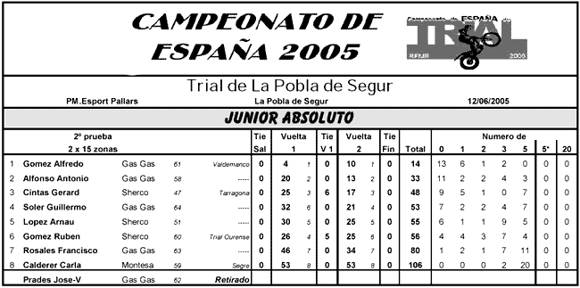 - Alfredo Gomez (14) hizo lo mismo en Junior, también con diecinueve puntos sobre el segundo, Antonio Alfonso (33) y treinta y cuatro sobre Gerad Cintas (48). Entre los Junior 125 victoria también clara para el nuevo piloto Todotrial, David Millan (36), con veintidós de ventaja sobre Mario Román (58) y veintisiete sobre Igor Urquizu (63).
