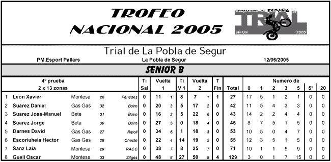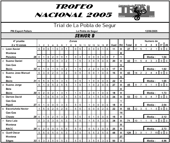 - Entre los Senior B, se repitió la historia de siempre, con Xavi León y la 4RT Martin Clerch muy por encima de los demás. Quienes más se le acercaron fueron los gallegos Suarez, seguidos por David Darnés. Escorihuela y Laia no tuvieron su día y fueron sexto y séptima, con Guell cerrando la clasificación.