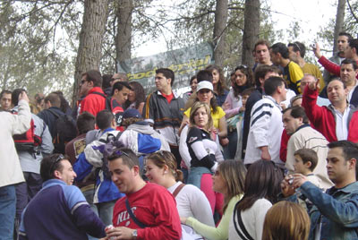 Aunque el sábado se temía que la lluvia pudiese chafar el trial, al final no fue así, y una gran cantidad de público se daba cita en los bosques de la población para presenciar el espectáculo. Cantidad de gente y motos de trial circulaban entremezclados entre los caminos y los pinos, mochileros y pilotos incluidos, tanta gente llegaba en ocasiones a parecer un caos. Los aparcamientos estaban repletos de coches, y montones de peñas trialeras andaluzas acudían a lomos de sus monturas. Desde luego en muy pocos triales puede verse tanto público, y especialmente tanta gente en sus motos de trial.
