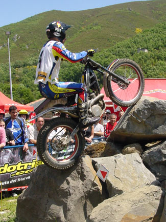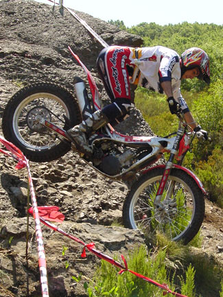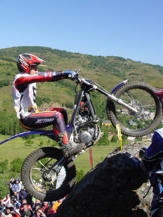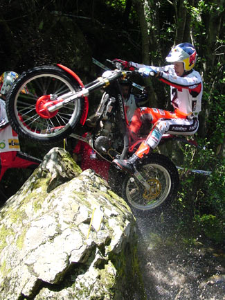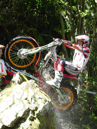 Con más ceros en la zona cuatro para todos los pilotos de cabeza excepto un uno tonto de Cabestany, parecía que el trial iba a ser de muy pocos puntos, pero las cosas empezaron a cambiar en la sección siguiente la primera de agua. Las zonas marcadas en el cauce y los pronunciados laterales del río eran realmente bonitas, con espectaculares pasos, escalones, saltos que además se debían afrontar en un terreno variable con piedras sueltas y sin demasiada adherencia. Así en la zona 5 sólo los dos primeros en superarla (del top 5), Fajardo y Freixa lograban el cero, mientras Bou, Raga y Cabes se dejaban un punto.