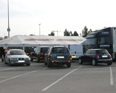 El paddock estaba ubicado en el aparcamiento del parque temático Port Aventura, que todavía no registra un lleno al máximo pues este fin de semana era precisamente la inauguración de temporada. Un espacio enorme para el paddock, pero sin orden ni concierto, dando una imagen totalmente desangelada, con los inconvenientes añadidos de que no había corriente eléctrica ni toma de agua.