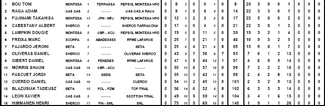 A partir de este quinto puesto, las puntuaciones se disparaban, el trial para los cinco primeros casi fue un paseo, y es que el nivel que demuestran los que están en el top 5 del mundial es estratosférico. El resto intenta no perder comba, pero es muy difícil seguir a estos malabaristas de la moto.