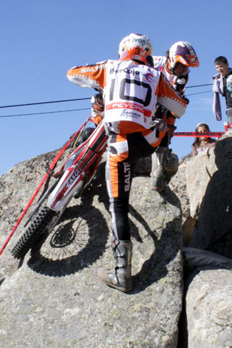 La zona 5 se encontraba ya bastante alejada y no fue problema para los top, al contrario que las tres siguientes, situadas juntas en un grupo algo más accesible al público tras un paseo laderas arriba. Mientras la 6 no tenía demasiados problemas pese a sus nimerosos cortados entre grietas y saltos para sortearlas, la 7 tenía bastante dificultad en una subida por una empinada roca a la que había que llegar volando pues su base era en vacío, y además se mostraba bastante resbaladiza. Este paso costó un fiasco a Freixa y un uno a Cabestany, mientras los jovenes, Gómez, Oliveras, Peydro y Millán no lograron superarla en ningún intento. Más detalles podréis ver en el video del trial que publicaremos antes o después...