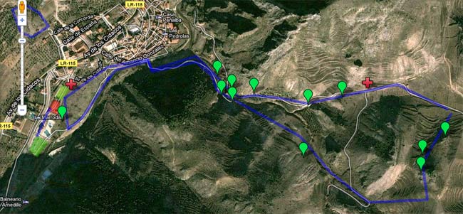 El recorrido tiene su salida en el frontón y se dirigirá hacia el barranco de las Yeseras donde nada más comenzar nos encontraremos con la zona Nº 1, el terreno que predomina son las rampas de tierra y algo de roca. Muy cerca está la Zona 2.