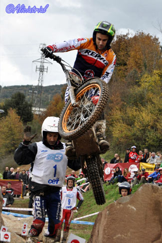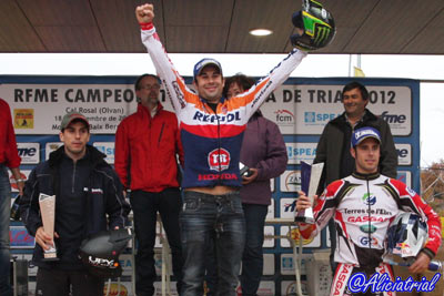 Pero Bou daba una muestra más de superioridad sobre el complicado terreno de Cal Rosal y finalmente sumaba 13 penalizaciones que le otorgaban su cuarta victoria en el Campeonato, tercera consecutiva y con ello revalidar su título como Campeón de España, acumulando así la victoria en todas las competiciones en que ha participado el Campeonato del Mundo, el Campeonato del Mudno Indoor (X-Trial), el Campeonato de España Indoor, y el Trial de las Naciones o mundial por equipos. Jeroni Fajardo lograba mantener su buen ritmo y finalizaba su mejor trial del campeonato al ser segundo a sólo 3 puntos de Bou, mientras el tercer peldaño del podio era para Adam Raga, aunque ya algo alejado al sumar 27 penalizaciones. Fuera del podio se quedaba Albert Cabestany con 39 puntos, quinto era Dani Oliveras con 48, y muy cerca de él lograba la sexta plaza Jorge Casales con 51, imponiéndose en su lucha particular con Pere Borrellas, séptimo con 54, y Francesc Moret, noveno con 62. Los franceses Alexandre Ferrer (Sherco) y Benoit Dagnicourt (Beta) eran octavo y décimo con 59 y 88 puntos respectivamente, cerrando la clasificación el italiano Gianluca Tournour (Gas Gas) con 99, y el valiente Jesús Martín (Gas Gas-Nitram) con 101. En la final del Campeonato de España TR1, tras Bou se coloca subcampeón Adam Raga con 100 puntos seguido de Albert Cabestany con 86. Jeroni Fajardo es cuarto con 73, Pere Borrellas quinto con 57, Jorge Casales sexto y Pere Borrellas séptimo, ambos con 55 puntos. Toni Bou: Hemos cerrado la temporada con el mejor resultado en una prueba muy bien planteada y de gran nivel selectivo. Revalidar el título de Campeón de España ha sido el remate ideal a una temporada perfecta, de las que soy perfectamente consciente que no son fáciles de repetir. Me siento muy feliz. Con Montesa hemos ganado todos los campeonatos en los que hemos participado, igual como lo habíamos hecho en dos ocasiones anteriores, pero si tuviera que elegir entre las tres diría que esta ha sido la mejor temporada de mi carrera deportiva, tanto por el número de victorias, por como hemos trabajado y luchado, y por mis sensaciones sobre la moto.