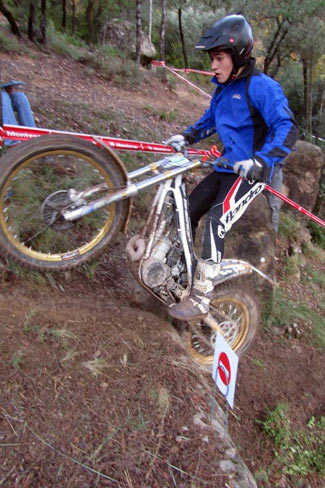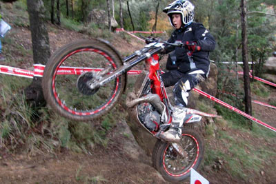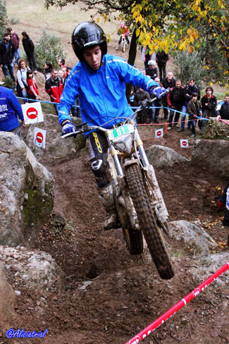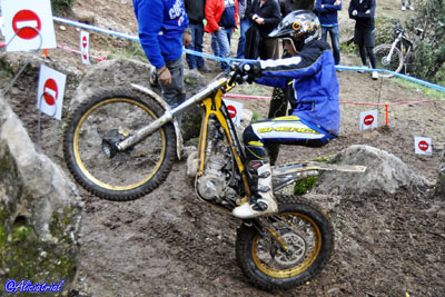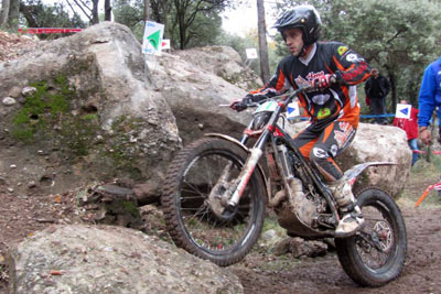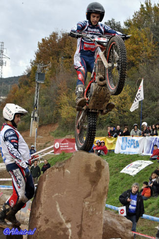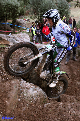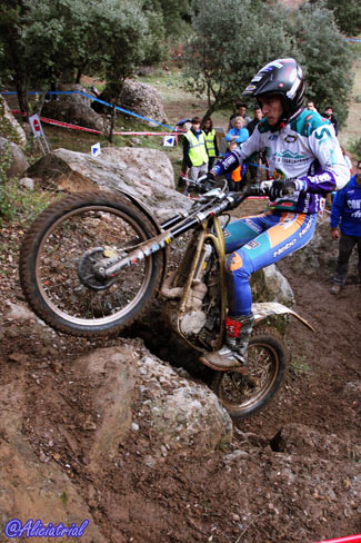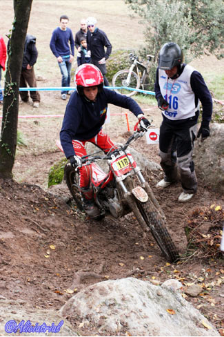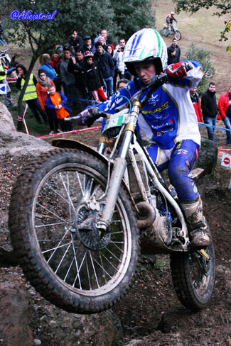 José Mª Moral con 69 puntos perjudicadopor una penalización de tiempo, y Nacho Martín con 78 completaban la clasificación, este último debutando tras su paso desde Junior. Como se aprecia en las clasificaciones fue en un trial con un nivel de complejidad muy alto para los pilotos de la categoría. Además de Nacho Martín, también debutaban en la categoría otro piloto junior, aunque no podía puntuar por cuestiones de reglamento al no cumplir la edad para pilotar una moto superior a 125. Este era el joven bilbaíno Jaime Busto, que debutaba en la categoría al haberse adjudicado en Valdemanco el título Junior, y que a pesar de no puntuar, de haberlo hecho hubiese sido... ¡el vencedor! Y es que Busto sigue mostrando un altísimo nivel de pilotaje y fue quien lograba penalizar menos en las 24 zonas del trial. El año que viene habrá que seguir con atención su evolución en TR2. TR3, Marc Horrach vence y es subcampeón En TR3 el título ya se adjudicó en la prueba de Vilanova a favor de Francesc Recio (Beta), que aprovechó para no asistir a Valdemanco ni a esta cita de Cal Rosal. Por tanto lo que estaba en juego era el título TR2, al que optaban los dos únicos pilotos con más participaciones, a pesar de haber fallado a dos pruebas cada uno antes de Cal Rosal, Marc Horrach (Gas Gas) y Hector Gairín (Gas Gas). Este último llegaba con una ligera ventaja, pero sería el mallorquín quien se llevaba la victoria por tan sólo un punto, 41 para Horrach y 42 para Gairín. Por su parte Victor Batalla (Gas Gas), que había comenzando liderando la prueba tras la primera vuelta, empeoraba en la segunda y finalmente era tercero con 55 penalizaciones.