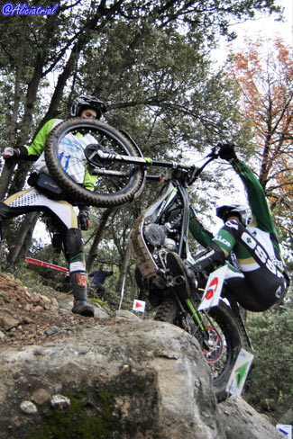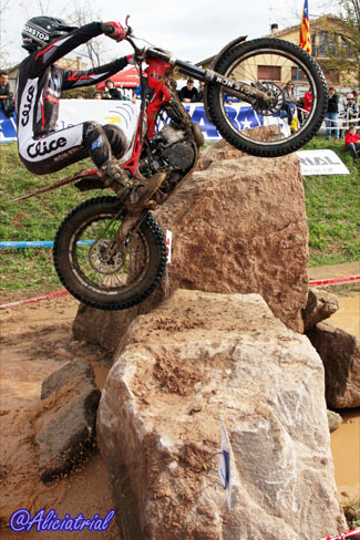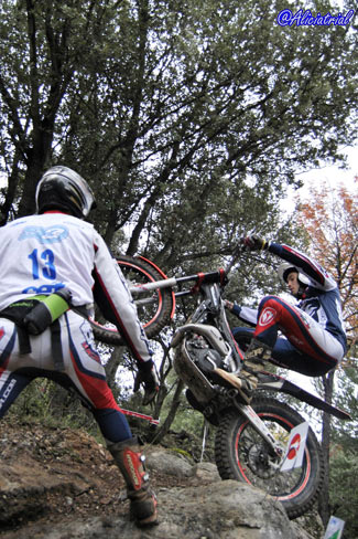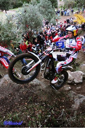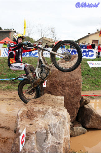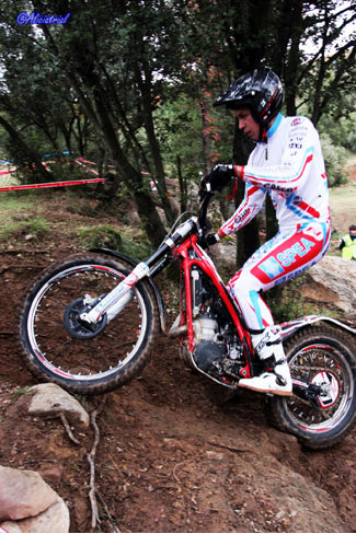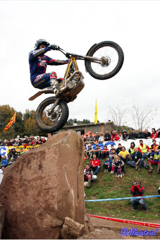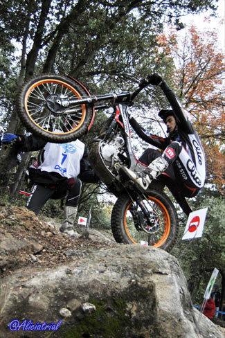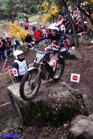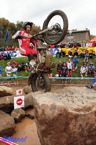 Todas se disponían en un atractivo recorrido de 10 kilómetros, situadas de manera que el público podía acceder fácilmente en sus vehículos y con grandes espacios de aparcamiento, así se facilitaba el acercamiento de este deporte a los aficionados. Además quien quisiera podía obtener un pase para realizar el recorrido con su moto de trial por sólo 5 euros, animando a los aficionados a disfrutar de una gran jornada de trial con los mejores pilotos del panorama nacional. Ya en la jornada previa el ambiente había sido auténticamente trialero, ya que a los entrenamientos de los tops y las verificaciones del campeonato de España se sumaba la penúltima prueba del Campeonato de Cataluña, que con el nuevo formato de este año está atrayendo mayor participación y cuyos resultados finales podéis ver pinchando aquí. Así tanto el sábado como el domingo, la afluencia de aficionados fue muy buena, demostrando que en Cal Rosal un año más se han hecho bien las cosas para fomentar este deporte y hacer que tanto los trialeros como el público general disfrutasen al máximo. Las categorías inferiores comenzaban temprano, a las 8:30, realizando dos vueltas completas y dejando el paso a las zonas prácticamente libre a los pilotos de TR1, que iniciaban el trial bastante más tarde ya que debían completar una sóla vuelta con dos pasadas consecutivas a cada zona. TR1, cuarta victoria para Bou, que revalida el título En la categoría máxima TR1, Toni Bou llegaba con una ventaja de nueve puntos sobre su más inmediato rival, Adam Raga (Gas Gas) tras haber obtenido tres victorias y dos segundos puestos frente a las dos victorias y tres terceras plazas de Raga. Albert Cabestany (Sherco) llegaba en tercera posición pero sin opciones al título aunque con el tercer puesto garantizado gracias a la ausencia de Jeroni Fajardo (Beta) en el Trial de Pobladura de las Regueras.