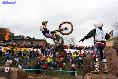 Desde los primeros momentos Bou parecía completamente inspirado y decidido a llevarse el trial y con ello el título, pero a diferencia de lo que se esperaba era Jeroni Fajardo quien se mantenía más cerca, realizando magníficas pasadas a las zonas que podían poner en peligro el liderato de Bou. Y es que la diferencia inicia de Bou se fue recortando tras realizar este su segundo fiasco del día, lo que dejaba a Fajardo a apenas tres puntos en la segunda posición. Por el contrario, Adam Raga parecía menos inspirado que de costumbre y cometía más errores sobre todo en las primeras pasadas a las zonas, aunque en sus segundos intentos lograba corregir. El resto de pilotos se mostraban mucho más alejados, e incluso Albert Cabestany no lograba rendir y mostrar su verdadero nivel, incluso teniendo que afrontar algún obstáculo hasta en tres ocasiones después de mostrar su domino de la "marcha atrás" ya que esta está permitida en el reglamento de este año. Quien sorprende cada día más es Jorge Casales (Gas Gas), que se mostraba muy inspirado y cada vez más cerca de los pilotos de cabeza. Se nota que su estancia en Cataluña y los entrenos con Adam Raga le están ayudando mucho a incrementar su nivel. Así Casales aumentaba aún más el interés por la otra gran lucha que se decidiría en este trial en esta máxima categoría, la que se libraba por el quinto puesto entre los jóvenes promesas Francesc Moret (Montesa), Pere Borrellas (Gas Gas) y el propio Jorge Casales, ya que llegaban aquí con apenas cuatro puntos de diferencia en la general y en este orden. También Dani Oliveras (Ossa) parece motivado este año y está sabiendo aprovechar la nueva oportunidad que desde la renacida marca del trébol le han dado para retornar a la competición, aunque en su caso combinar la labor de piloto con la de técnico y desarrollador de los modelos de la marca le hace las más complicado.