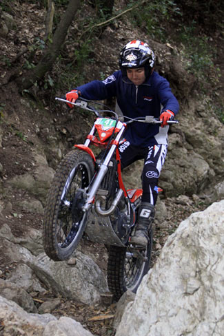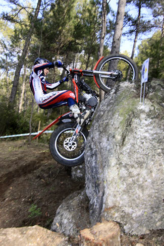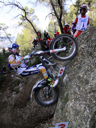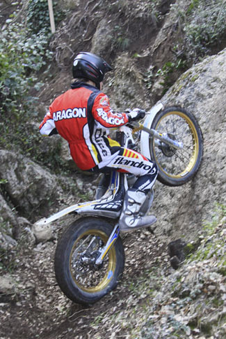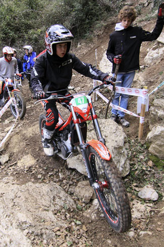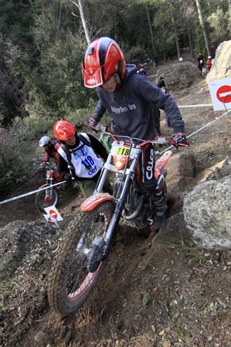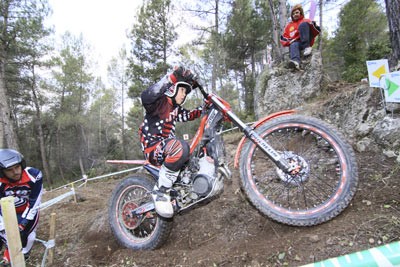 Las zonas mostraban un gran nivel técnico en todas las categorías, quizás demasiado complicadas y también con algunos pasos demasiado rebuscados, ratoneros y estrechos, no demasiado trialeros. Esto hacía que fuesen favorables y al gusto de los primeros clasificados, pero no tanto del resto, a los que se veía arrastrarse por las zonas sufriendo más de lo necesario, lo cual no es bueno para la motivación. Cierto es que las zonas hay que trabajarlas y esforzarse en ellas pero sin superar el límite que lleve al tan frecuente y preocupante abandono del trial que se está dando últimamente. El recorrido era muy semejante al de años anteriores, y las zonas se mostraban secas y adherentes excepto en algunos lugares en los que la nieve caída la semana pasada había formado algo de barro. Tanto Raga como Bou empataban en la puntuación de las primeras pasadas a 8 puntos, manteniendo la igualdad también en las segundas pasadas, por lo que se llegaba a las últimas zonas en un final emocionante. Bou se estaba mostrando como siempre, casi insuperable, pero Raga estaba muy inspirado y le salían las cosas realmente bien.