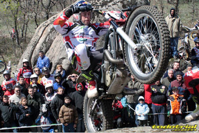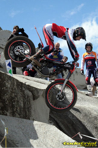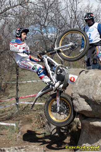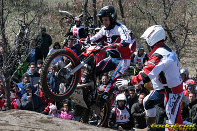 Raga no daba tregua, no fallaba ni en los pasos más complicados y se le veía muy fino en todo momento, con tranquilidad y mucha técnica. Pero Bou no se quedaba atrás, realizaba algunos pasos como nadie, a una sola rueda y parecía que sólo le cabía esperar un fallo de su rival. Por su parte Fuji se dejaba dos unos en la zona 7 y un fiasco en la ocho, para después no volver a fallar más. Esto hacía que Fajardo se colocase dos puntos por delante, pero un discutido fiasco en la zona 10 le complicaba las cosas. La rueda trasera de su Beta patinó en lo alto de un escalón, torciendo el soporte de una flecha y rompiendo esta. El juez de zona le marcaba fiasco, pero Fajardo reclamaba que según el reglamento de este año si la moto pasaa por dentro aunque tocase la flecha no es fiasco. Al final la decisión del juez fue inapelable. Albert Cabestany seguía sin parecer encontrarse cómodo, fallando mucho en las primeras pasadas por exceso de confianza (19 puntos), mientras en el cómputo total de las segundas pasadas sólo sumaba 2. Moret y Borrellas seguían enzarzados en su lucha particular, mientrasya más distanciado Jorge Casales se alejaba poco a poco de Tournour.