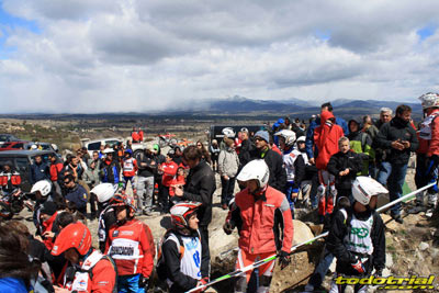 La lluvia y la nieve del sábado presagiaban un trial muy difícil y pasado por agua, y así amanecía también el domingo, en el que incluso empezaban a caer algunos copos de nieve. Pero al poco tiempo de comenzar la prueba, las precipitaciones daban paso a un fuerte viento que en muy poco tiempo secaba completamente el terreno. Esto hacía que las zonas al final fuesen mucho más fáciles para los pilotos top y que hubiese que afinar al máximo para no cometer ni el más pequeño error. Los pilotos del resto de categorías lo agradecieron, pues pese a ello las zonas no fueron fáciles sino todo lo contrario, como se puede apreciar en unas puntuaciones más bien altas en las clasificaciones. Ya a primera hora de la mañana la afluencia de público era bastante buena, muchos de ellos aficionados a los mandos de sus motos de trial, que pagando una cuota recibían un dorsal y podían seguir todo el recorrido tanto el sábado como el domingo. Muchos aprovecharon la ocasión para ver a los grandes en la carrera o los entrenos y para montar con tranquilidad durante todo el fin de semana. Así con la cuota de inscripción podían seguir la prueba y practicar trial cómodamente colaborando al mismo tiempo con la organización.