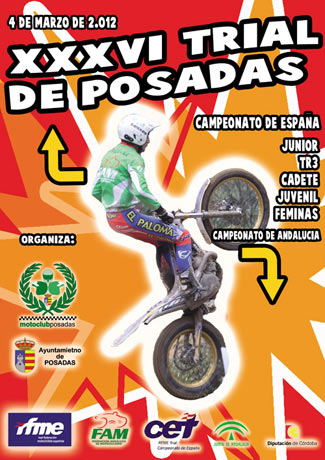 Andalucia de Trial en las categorias TR1, Junior, TR2, TR3, Veteranos, y Aficionados. Todos estos alicientes nos pueden deparar que esta nueva edicion del Trial de Posadas sea muy atractiva para todos, participantes y aficionados. Posadas y su Motoclub se preparan como en cada edición para recibir a todos los que se animen a asistir a esta prueba con los brazos abiertos, e intentando realizar un buen trabajo para que todo salga lo mejor posible. Datos de la prueba El Motoclub Posadas organiza el XXXVI Trial de Posadas, que es una competición de carácter Nacional y puntuable para el Campeonato de España y de Andalucía de las categorías convocadas. La prueba tendrá lugar el día 4 de Marzo de 2012, en la localidad de Posadas, provincia de Córdoba; desarrollándose esta de acuerdo con el Código Deportivo de la RFME, y el reglamento del Campeonato de Andalucía de Trial.