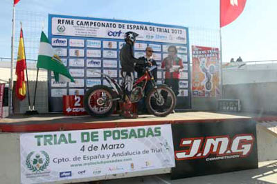En Juveniles 80, que también llegaban a su primera cita del año, cómoda victoria de Sergio Ribau que llegó a la meta con 10 puntos menos que su inmediato perseguidor, Iván Ortiz que sumó 40 puntos. El podio lo completó Rodrigo Marchal con 45 puntos. Y Juveniles 125 c.c. el gallego Gabriel Marcelli rompió la hegemonía catalana en las categorías inferiores sumando una clara victoria al sumar sólo 11 puntos (7+4) por los 31 (15+16) del leridano Jorge García y los 33 del andorrano Oriol Pi. La siguiente cita del Campeonato de España será en Ibiza el 25 de marzo, puntuable para las categorías TR1, TR2, TR3, TR3+35, Junior y Cadete. Campeonato de Andalucía En la categoría reina, TR-1, saltó la sorpresa ya que si en un principio la victoria se la tenían que jugar dos de los clásicos de la categoría, el doble y vigente campeón, el jiennense José María Moral (Beta) y el pentacampeón hispalense, Sergio Moreno (Gas Gas), el cordobés Joaquín Salcedo (Gas Gas), campeón Júnior los dos últimos años, ha saltado esta temporada a medirse con los grandes y lo ha hecho de manera sensacional, dando un golpe en la mesa y avisando que hay que contar con él.