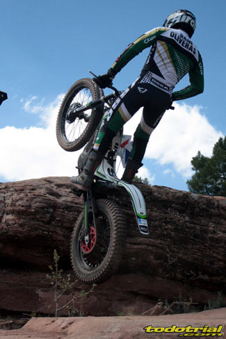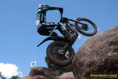 La resistencia física se hacía fundamental en este trial y el cansancio hizo mella en todos, y más entre los top, llegando incluso a ser determinante para el resultado final como veremos... Las cuatro primeras zonas estaban situadas en un pinar, agradeciéndose la sombra, las siguientes a lo largo del camino asfaltado del "oasis", donde se congregó el mayor público. Las cosas comenzaban bien para Bou, Raga, Cabestany y Fajardo en las 2 primeras zonas, que eran superadas sin problemas, pero enla zona 3 había un fortísimo escalón en negativo al que había que llegar en un vuelo muy alto y sin rampa alguna, viéndose aquí las primeras dificultades. Fajardo, que marchaba abriendo las zonas sumaba 2 unos, a continuación Raga se dejaba un uno pero en la segunda pasada se quedaba más corto y sumaba un fiasco. Bou era el siguiente y superaba la zona sin problemas, parecía que iba a ser uno de sus recitales. Cabestany se quedaba corto al primer intento, pero en el segundo pasaba a cero y a destacar el cero de Borrellas en su segundo intento, con la ayuda y buenos consejos de sus dos mochileros de lujo, Freixa y Colomer.