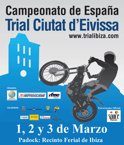 El Campeonato de España 2013 comienza en Ibiza La isla de Ibiza vuelve a acoger un año más una cita del Campeonato de España de Trial, en esta ocasión abrirá el campeonato 2013 para las categorías TR1, TR2, TR3, TR4, Junior y Cadete. Como ya ha quedado demostrado durante estos últimos años, Ibiza está siendo un ejemplo en la organización de pruebas de motociclismo, destacando su gran relevancia en las ediciones anteriores del Campeonato de España de Trial y en los triales de larga duración, con la organización de los 2 Días de Trial Isla de Ibiza, que está considerada una de las pruebas de más renombre nacional a la que acuden pilotos de todo el territorio nacional y de otros paises (Andorra, Francia, Italia, Inglaterra, Alemania )
