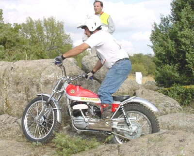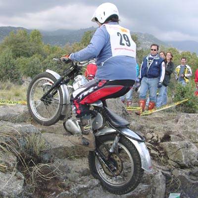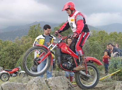 Otro que esta vez optaba por el nivel B era Manuel Casado, y como buen coleccionista dejaba a todos literalmente alucinados con su última adquisición, una Montesa Trial 250, una de las poquísimas que se conservan, de hecho sólo se tiene noticias de un par de ellas. Seguro que muchos no conocéis esta moto, se trata de la primera Montesa de trial, fabricada en 1967 en una limitadísima serie, según se dice de unas 44 unidades. Poco más tarde Montesa decidía fabricar en serie una moto de trial y nacía la primera Cota, la 247 de tambores grandes. La Trial 250 causó sensación, casi nadie había visto una antes y estaba en perfecto orden de marcha, aunque dejaba ver el paso del tiempo y echaba en falta una buena restauración. Pilotos y público agradecieron poder ver en acción a esta maravilla sobre las zonas de Becerril.
