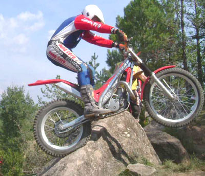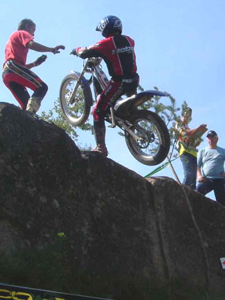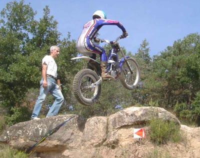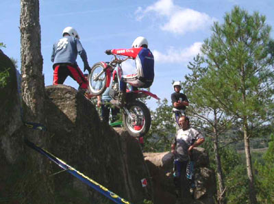 Otros dos incombustibles, Josep Carrera y Pere Vilageliu controlaban la 7 y la 8. Una 7 muy bonita, muy trialera por los diferentes pasos marcados a lo largo de la sección, y una 8 muy comprometida. Sólo tenía un punto de dificultad, pero era un paso extraño. La moto quedaba colgada de detrás en la piedra que acabábamos de subir, y de delante ya señalaba un escalón no muy alto, pero si totalmente cuadrado. Al abrir gas, el vacío trasero de la rueda descontrolaba la moto, y difícilmente se lograba pasar a cero. En la segunda y tercer vuelta, debido al paso de los corredores, se podía poner la rueda trasera en el llano en vez de dejarla colgada en la piedra, y pese a que el trozo para arrancar era estrecho, tenías el suficiente tiro para poder superar la sección a cero, ya que el resto de la zona sólo tenia un par de giros sin demasiada complicación.