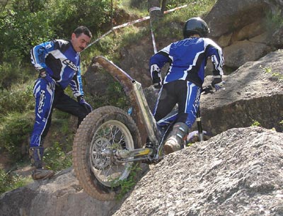 La zona en si, la formaba una entrada con mucha agua en la que más de uno se quedó con la moto ahogada, seguía con unas bellísimas rocas con muy buen agarre y una fuerte pendiente que luego se tenía que bajar por el lado contrario de una inmensa mole de roca. Una vez de vuelta en el nivel 0, otra fuerte rampa donde varias rocas dificultaban el paso, nos llevaba al final de una de las zonas mas bonitas de trial.