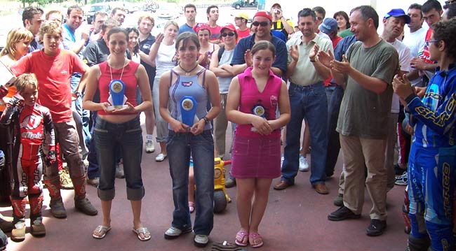 Salían las féminas en primer lugar, esas tres chicas que lo dan todo. En esta ocasión la victoria iba a parar a manos de Emma Castañeiras, en segundo lugar Isabel Ogando, pero olé para Vero Miguens, que marchando con la prueba a su favor, una caida en la ultima zona la hace pasar al tercer puesto y destroza la parte delantera de la moto.