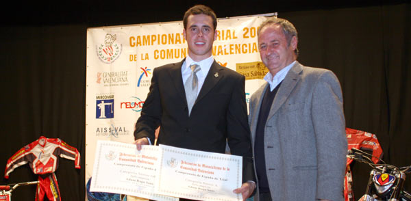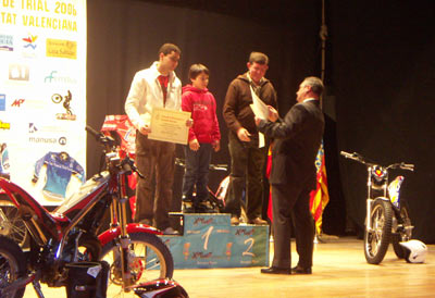 También recibieron premio por su colaboración Eloy Poyatos, Antonio Iglesias y Pablo Casanova. Pero sin duda el momento más emotivo fue cuando de la mano de Adam Raga, Rafa Ureña, campeon de veteranos en 2004 y que está pasando por un momento delicado, recibía un diploma. Por supuesto Adam Raga recibió el reconocimiento de la Federación por sus dos titulos de Campeon del Mundo de trial Indoor y Outdoor en el 2006.