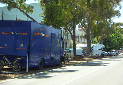 Y dicho esto, volvemos al trial en si. Los boxes estaban en la carretera de acceso al polideportivo, donde estaba ya acampado el Team Nacho Fernandez Sancho con su motor-home. Otros que se lo montan muy, pero que muy bien, son los Barberá, obviamente no llevan el montaje de su pariente Hector en el mundial de motociclismo, pero se lo organizan muy bien para pasar la mañana lo mejor posible.
