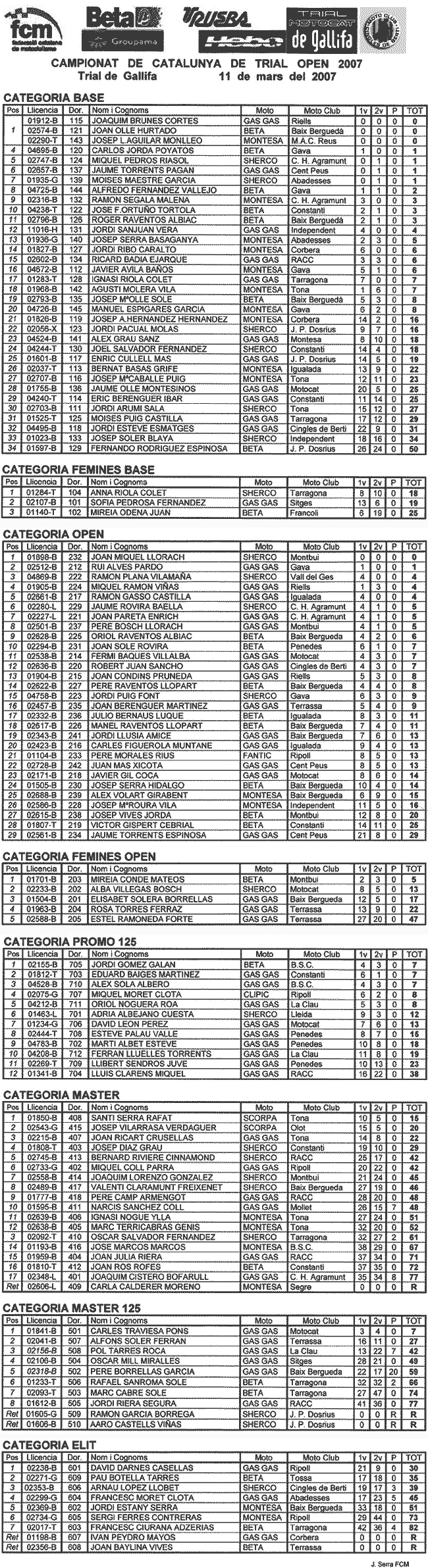 El Campeonato de Cataluña Open 2007 empezó el pasado 11 de marzo con el Trial de Gallifa, fruto de la estrecha colaboración entre el Moto Club Cingles de Bertí y Motocat, que han aunado esfuerzos para poder devolver a Gallifa una de las carreras del campeonato Catalán que se había perdido en los últimos años, y que era una de las más destacadas del calendario.