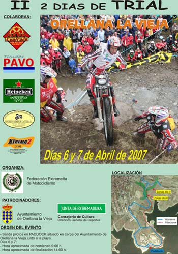 Los próximos días 6 y 7 de abril, en la localidad extremeña de Orellana, con el apoyo de la Federación Extremeña y las instituciones de esta localidad, un grupo de amantes del trial (Extremadura Trial), han puesto en marcha la celebración de dos días de trial, que cumplen su segunda edición.
