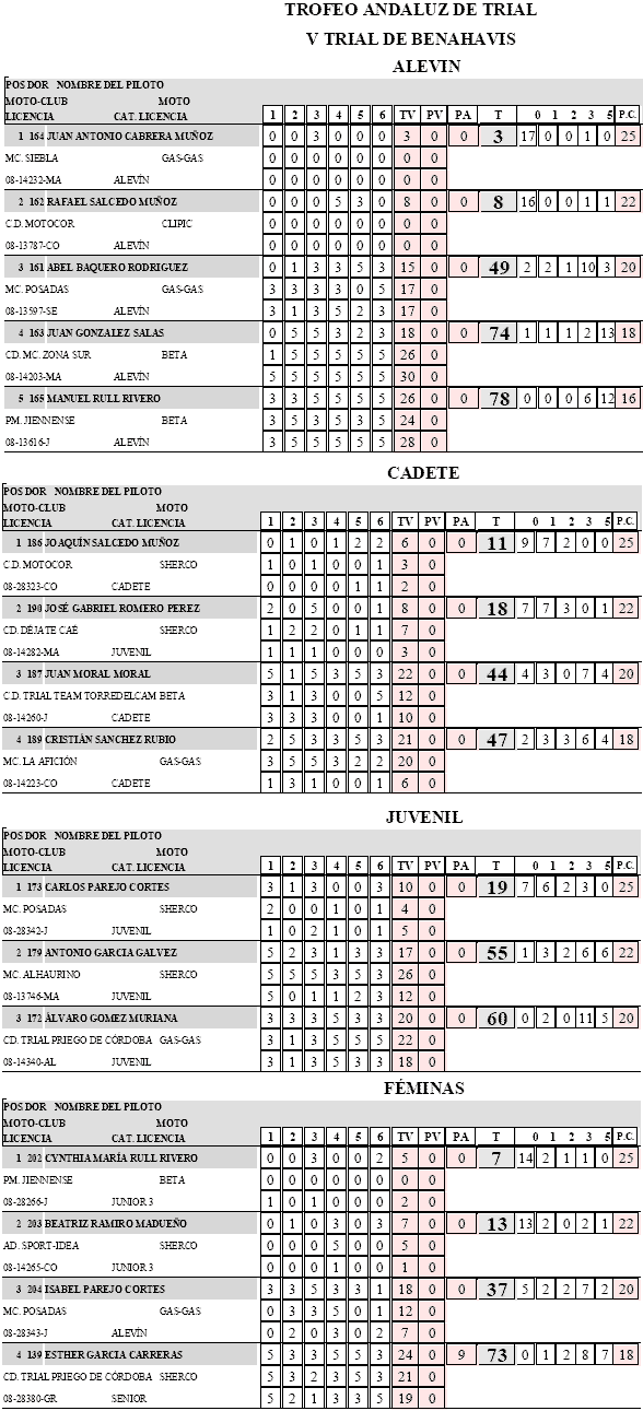 El certamen andaluz de trial visitó la localidad malagueña de Benahavís, que celebraba la quinta edición de la prueba en lo referido a puntuabildad para el campeonato. La prueba fue puntuable para las categorías Alevín, Juvenil, Cadete, Féminas y Clásicas.