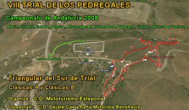 En cuanto al formato de la prueba y debido a la precipitación con la que se esta preparando será el habitual del Campeonato de Andalucía y ante todas las dudas que están surgiendo sobre si todas las zonas son artificiales, pasar a comentar el desarrollo de la prueba. Las zonas estarán marcadas sobre un recorrido de 5 km. aproximadamente, que ha servido varias veces para la celebración del Campeonato de España de Trial Bici, de hecho Rubén Ramírez, miembro del Trial Cúllar, ha sido varias veces campeón de España de esta especialidad. El recorrido se podrá seguir por completo en coche ya que todas las zonas serán accesibles, solo habrá 2 zonas con obstáculos que no estarán compuestos por maderas ni hormigón ni piedra y estas serán exclusivas para los Senior A y B, todas las demás serán o bien naturales o compuestas por estos materiales y accesibles para todas las categorías. Solo pediros vuestra comprensión ya que debido a la premura de tiempo con la que se ha preparado todo esto pues no se ha podido hacer de otra forma.