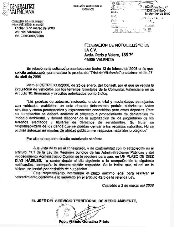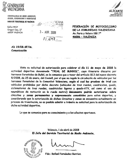Clara muestra de ello son los dos documentos de denegación de permiso que os adjuntamos, en el de Buñol se hace referencia incorrecta al artículo 10.3 del nuevo decreto 8/2008 de 25 de Enero del Consell, que regula la circulación de vehículos por los terrenos forestales de la Comunitat Valenciana, en el que se prohiben vehículos de 3 ruedas, cuadriciclos, quads, coclomotores de res ruedas, quadriciclos ligeros y quads-ATV, así como el uso de neumáticos de motocross en la rueda motriz.