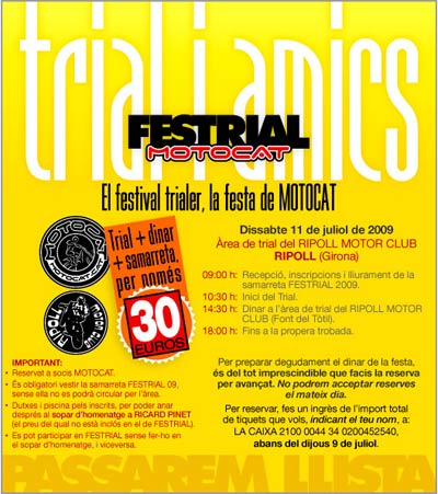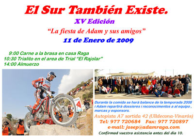 La actividad comenzará a las 9 con un almuerzo de carne a la brasa, para seguir a las 10:30 con un trialito en el área de trial "El Rajolar", y después la cominda a las 14:00. Durante la comida se hará balance de la temporada 2008 y Adam repartirá dossieres y reconocimientos al equipo, marcas y esponsors.