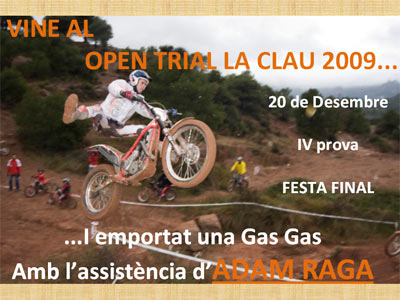 Una vez terminado se procecederá a la entrega de premios y al sorteo de una magnifica Gas Gas Pro 250, así como de una panera con una gran diversidad de obsequios. Los números para el sorteo se podrán adquirir en el Bar de La Clau hasta minutos antes del sorteo. Recordamos a los asistentes de las dos primeras pruebas del año, que con la inscripción se les obsequió con un número para el sorteo.