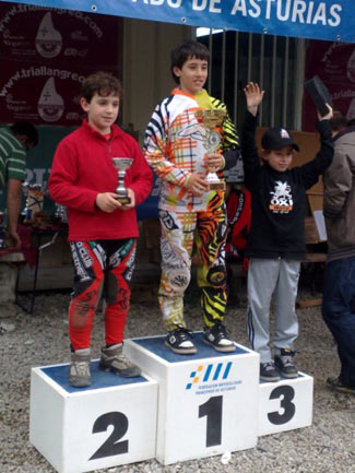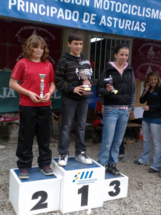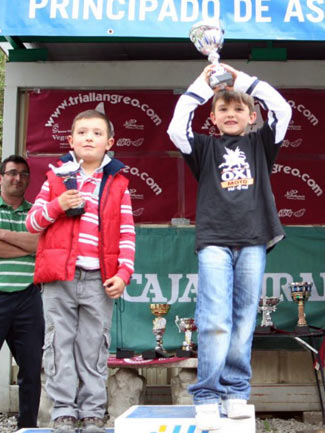 Los más pequeños también recibieron sus trofeos. En la foto están Roberto Lopez de Entrimo (Galicia) y Jorge Alvarez de Bueño y por detrás de ellos el presidente del Trial Langreo.