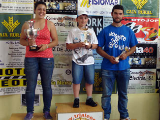 El jovencísimo asturiano del MC Asomo, Pablo Suárez Jambrina, vino hasta Berlanga para llevarse el primer puesto de esta categoría gracias a sus 7 puntos (2, 4 y 1). Verónica Calvo ya va ganando soltura en las carreras y guiada por su inseparable compañero y mentor, Raúl San Martín, en esta ocasión ganó a Javier Ánguez Herrera al realizar 2 puntos menos que él. Con 13 puntos (4, 6 y 1), Vero se subió, contentísima, al segundo puesto del cajón, animada por todos, ya que es, de momento, la única fémina de nuestra comunidad que se atreve con esto de las carreras de trial. Esperemos que cunda el ejemplo y en años venideros se apunten más chicas a este bonito deporte, con el ejemplo de Vero.