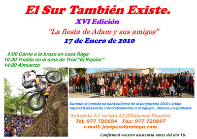 La actividad comenzará a las 9 con un almuerzo de carne a la brasa, para seguir a las 10:30 con un trialito en el área de trial "El Rajolar", y después la cominda a las 14:00. Durante la comida se hará balance de la difícil temporada 2009 que se le complicó a Adam a causa de la lesión de rodilla, y repartirá dossieres y reconocimientos al equipo, marcas y esponsors.