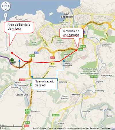 A quienes vengan por la autopista A8 desde Bilbao recordarles que hay un nuevo tramo de autopista que evita llegar hasta Donostia-San Sebastián y ahorra bastante tiempo y kilómetros. Este tramo, inaugurado recientemente, no está reflejado todavía ni en Google Maps ni en Google Earth. Este nuevo tramo está después del peaje de Zarautz dirección San Sebastián. Llegando al Área de Servicio de Arizeta hay que coger a mano derecha dirección Irún y tomar la salida hacia Hernani, que nos lleva directos a Astigarraga.